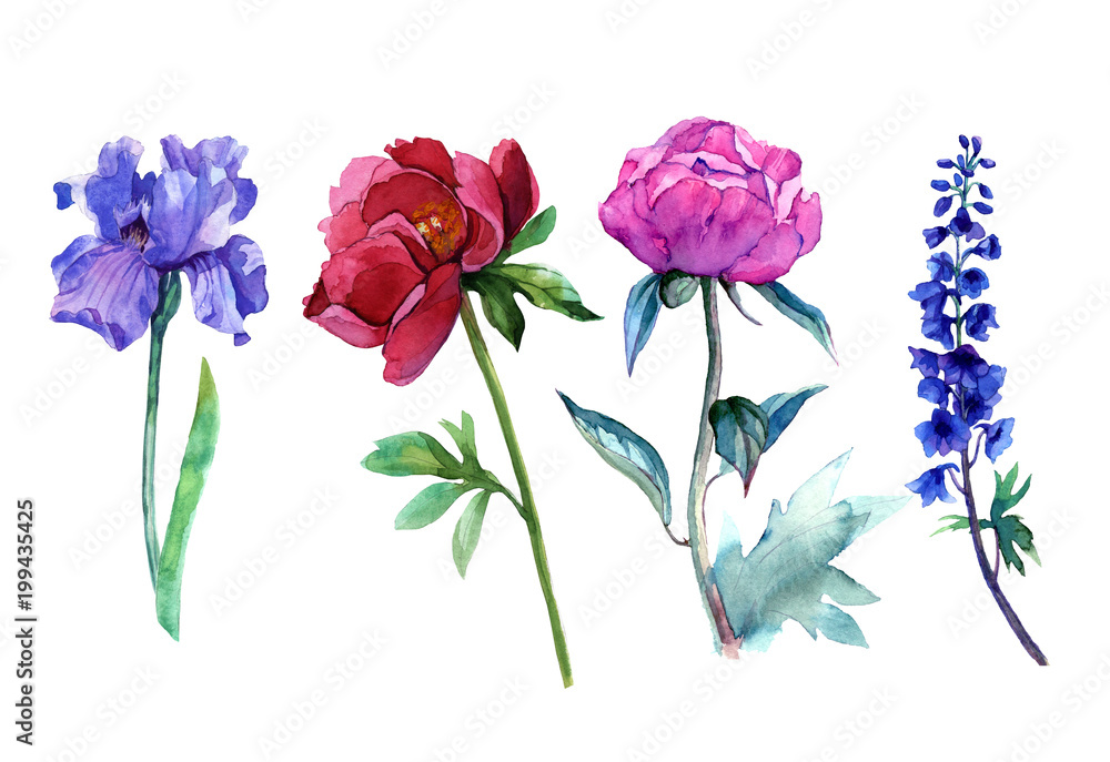 Watercolor Kwiaty Irys Piwonia Zestaw Pojedyncze Kwiaty